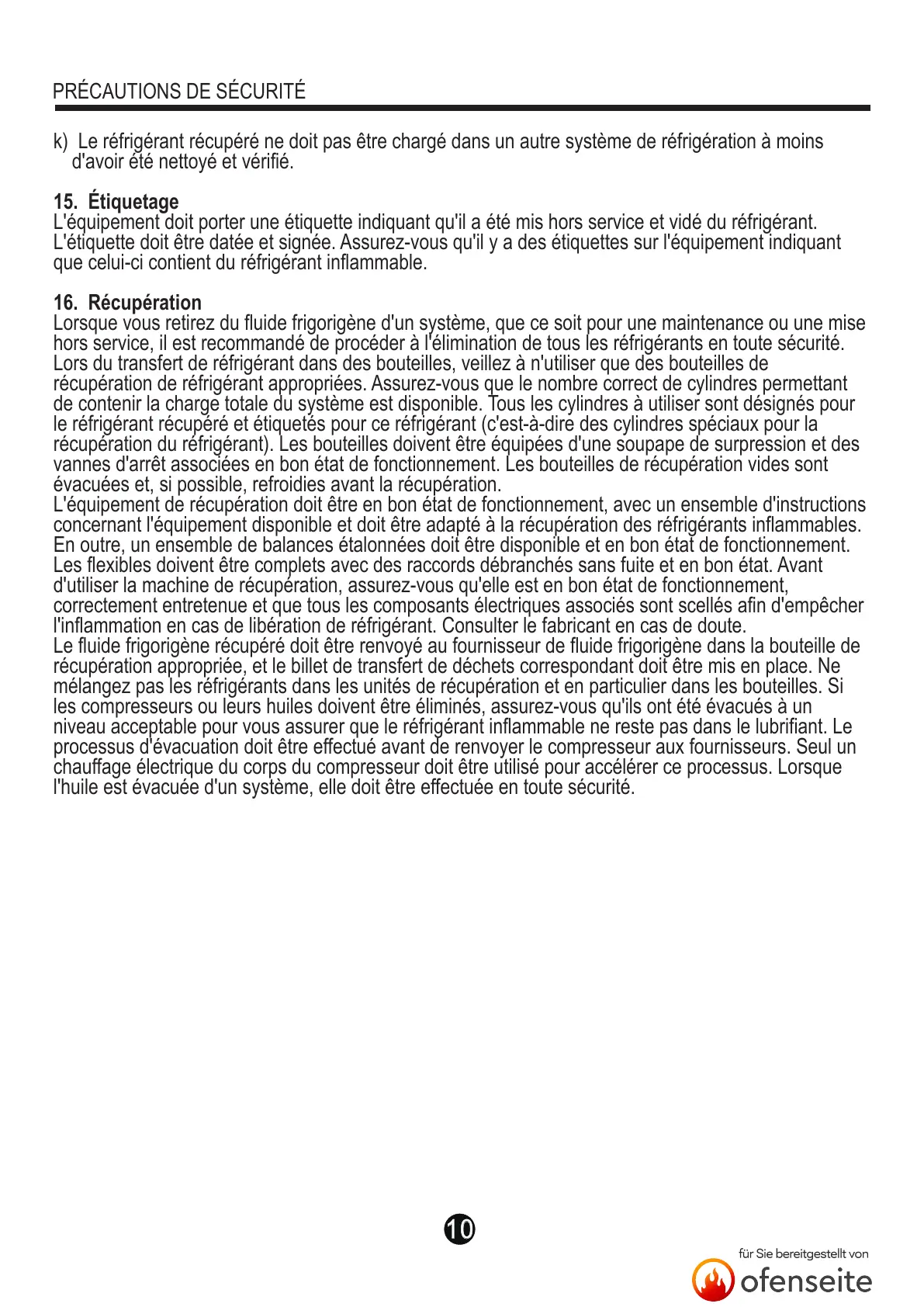 récupération du réfrigérant). Les bouteilles doivent être équipées d'une soupape de surpression et des