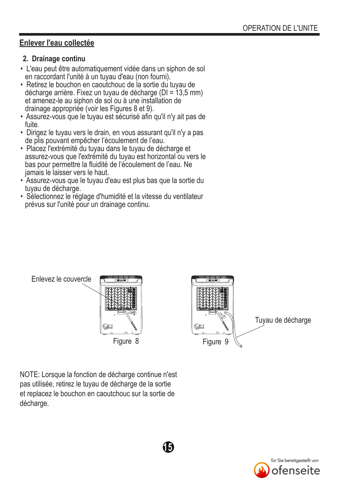 décharge arrière. Fixez un tuyau de décharge (DI = 13,5 mm)