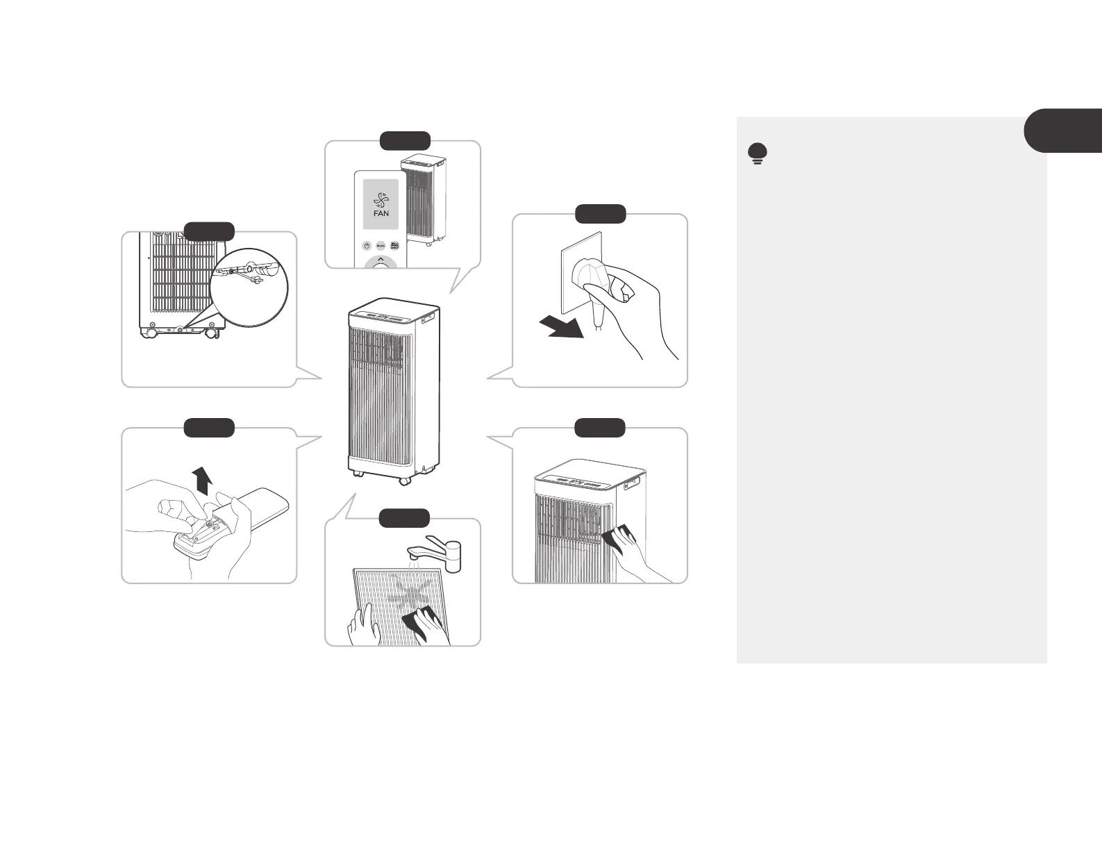 • Laat het apparaat gedurende 12 uur in de FAN (VENTILEREN)-modus in een warme kamer draaien om het te drogen en schimmel te
