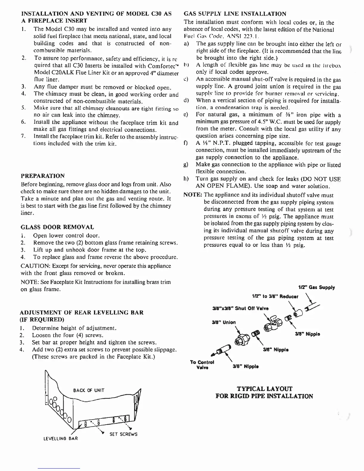 Comfortec C30 - Model C30 Fireplace Insert Installation; Flue Liner and Chimney Requirements; Damper and Cleanout Sealing; Glass Door Removal Procedure