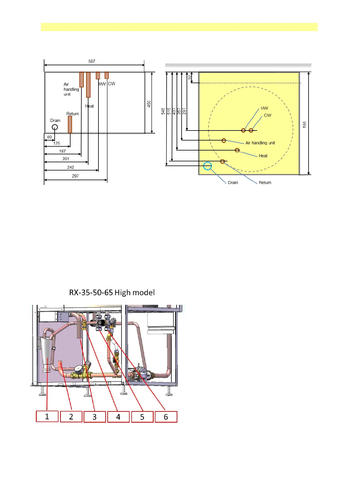 Dimensions and position of pipe connection RX35 / 50/65 High