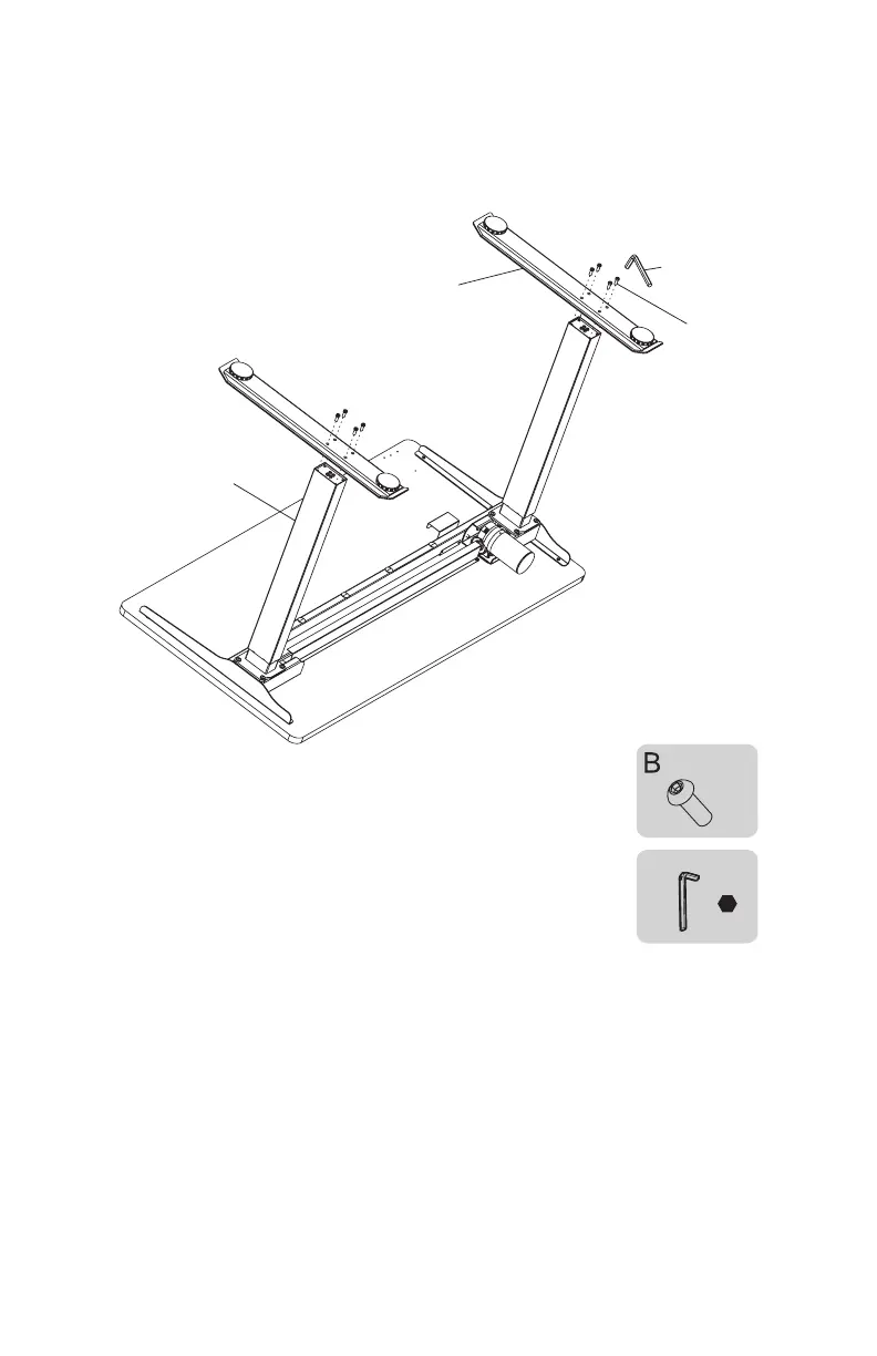 Install the Pedestals (4) to the lifting columns (2) using M6 screws (B) on each pedestal