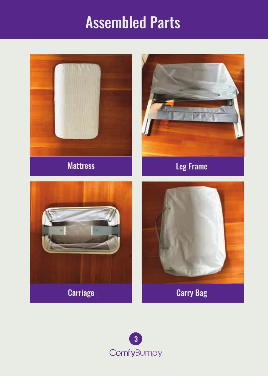 ComfyBumpy BEDSIDE CRIB - Identification of Assembled Parts; Mattress Identification; Leg Frame Identification; Carriage Identification
