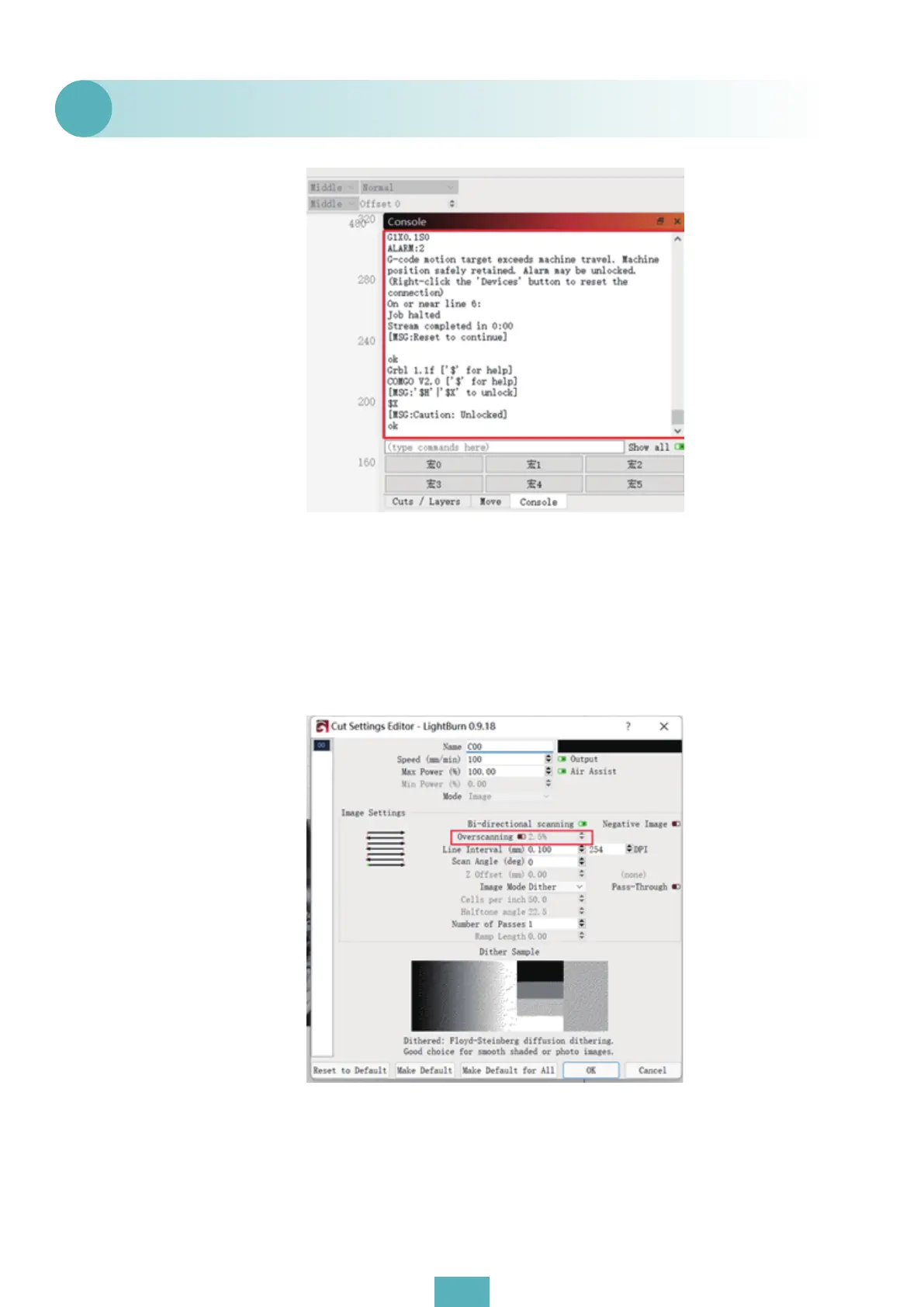“overscan” button is turned on, the X axis will perform a -2.5mm movement. Thus the alarm will