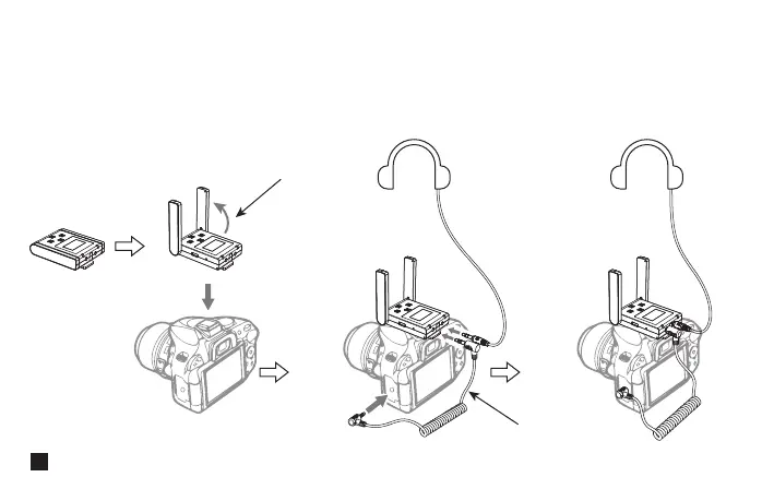 调节好天线角度,把接收器通过背夹夹到相机的热靴座固定;通过3.5mm TRS-TRS音频连接线连接接