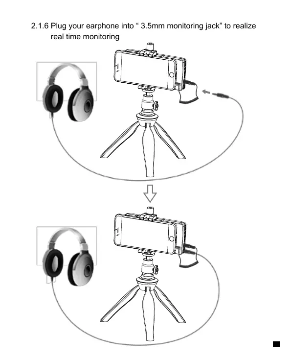 2.1.6 Plug your earphone into “ 3.5mm monitoring jack” to realize