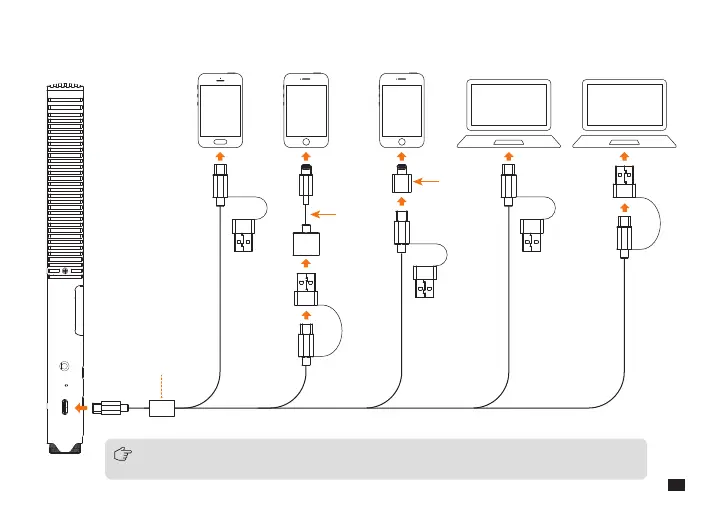 通过充电&输出二合一线和相关OTG音频转接线/转接头(如需)连接麦克风和手机/电脑