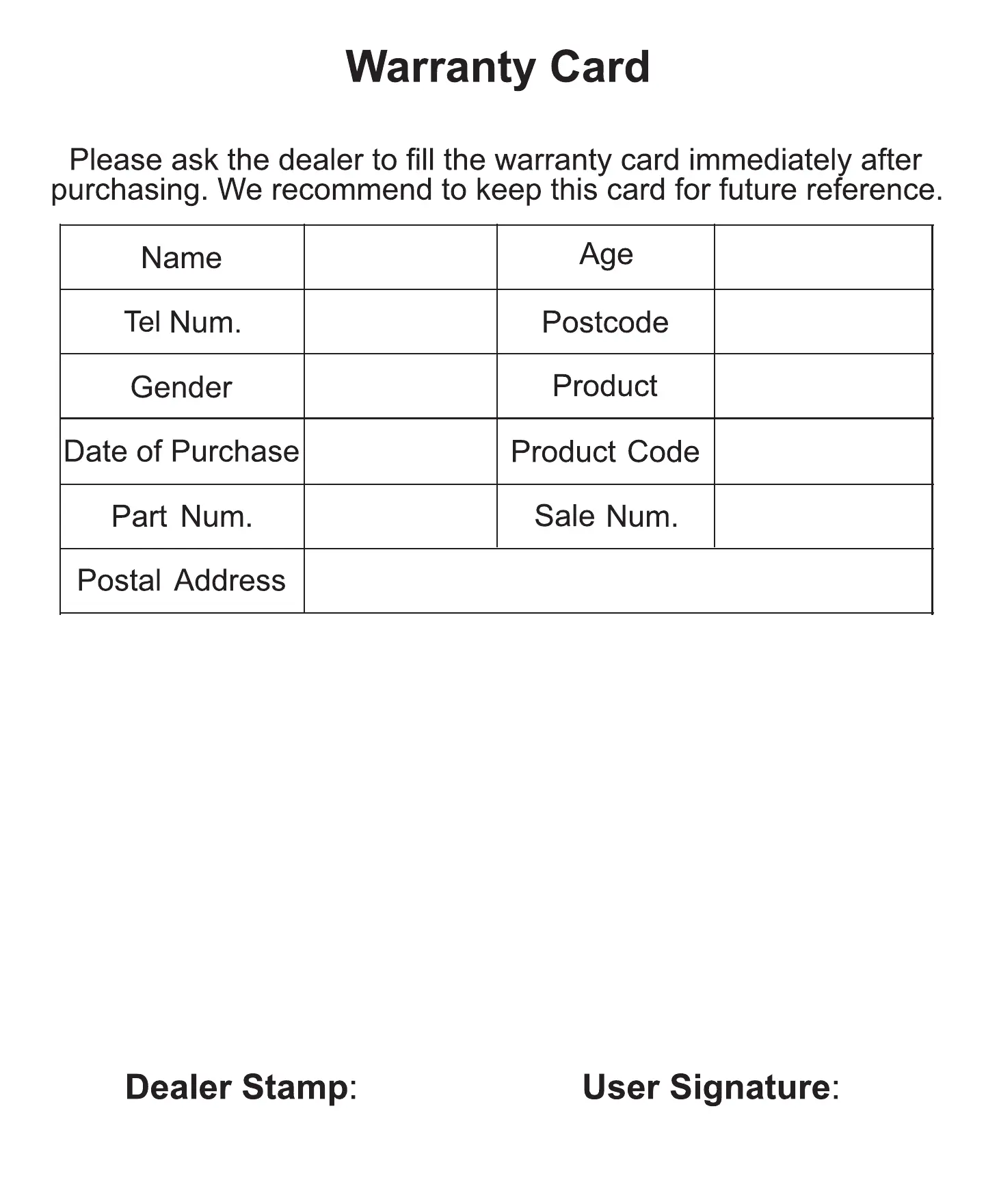 Please ask the dealer to fill the warranty card immediately after