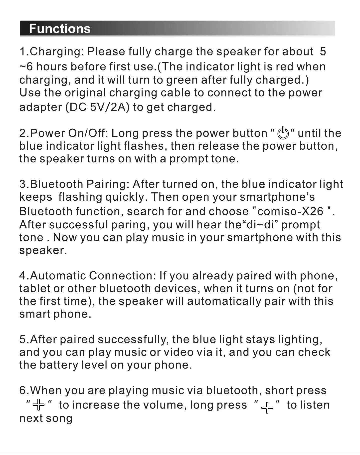 I.Charging: Please fully charge the speaker for about 5