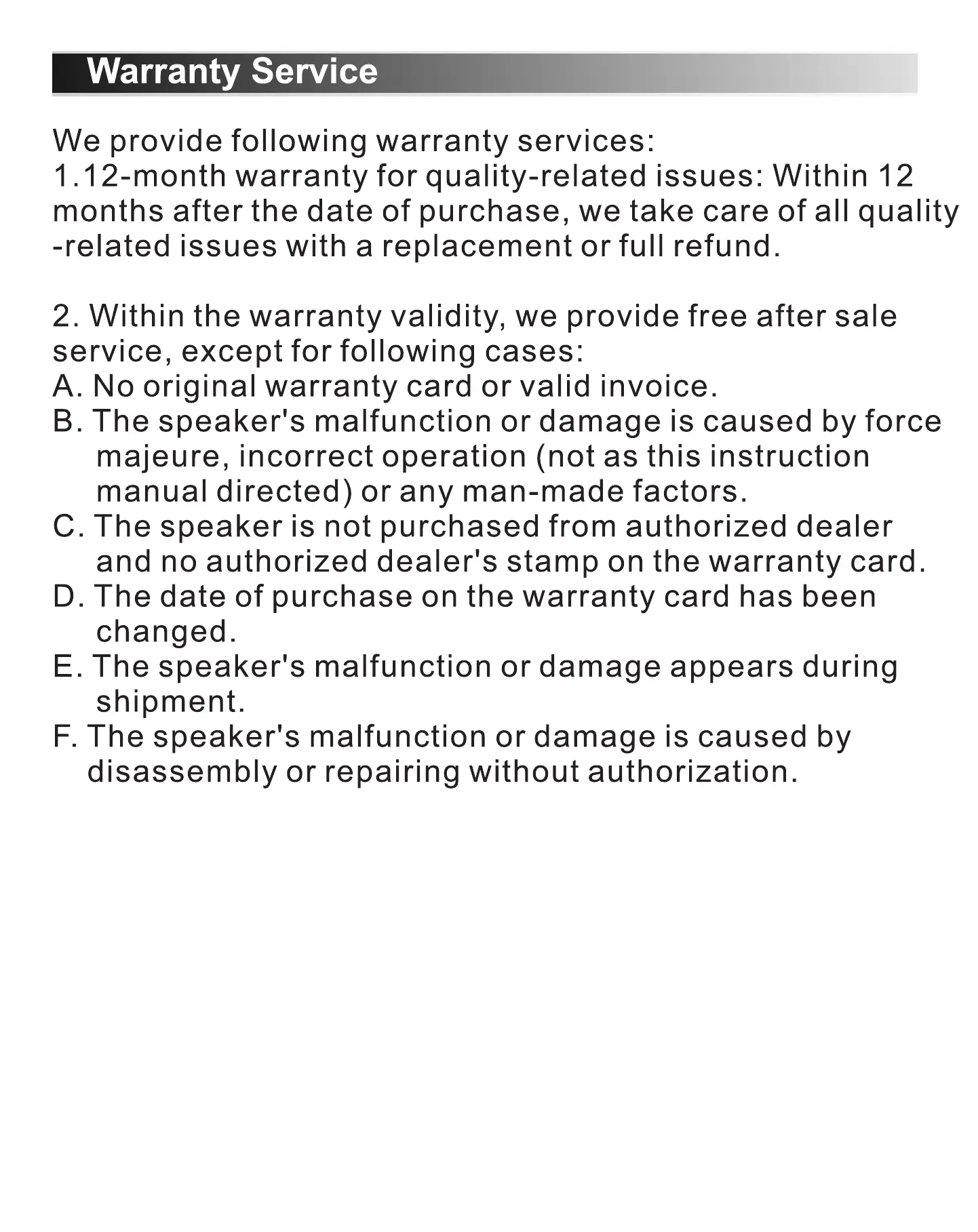 1.12-month warranty for quality-related issues: Within 12