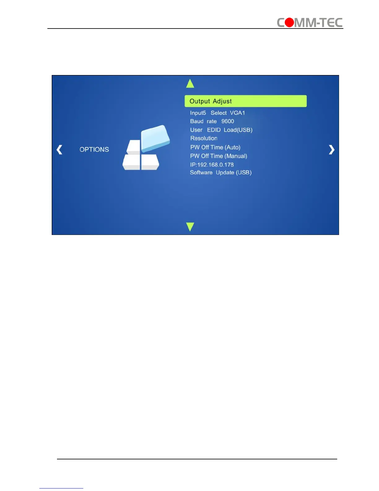 Includes Output Adjust, Input 5 Select, Baud rate, User EDID Load (USB), Resolution,