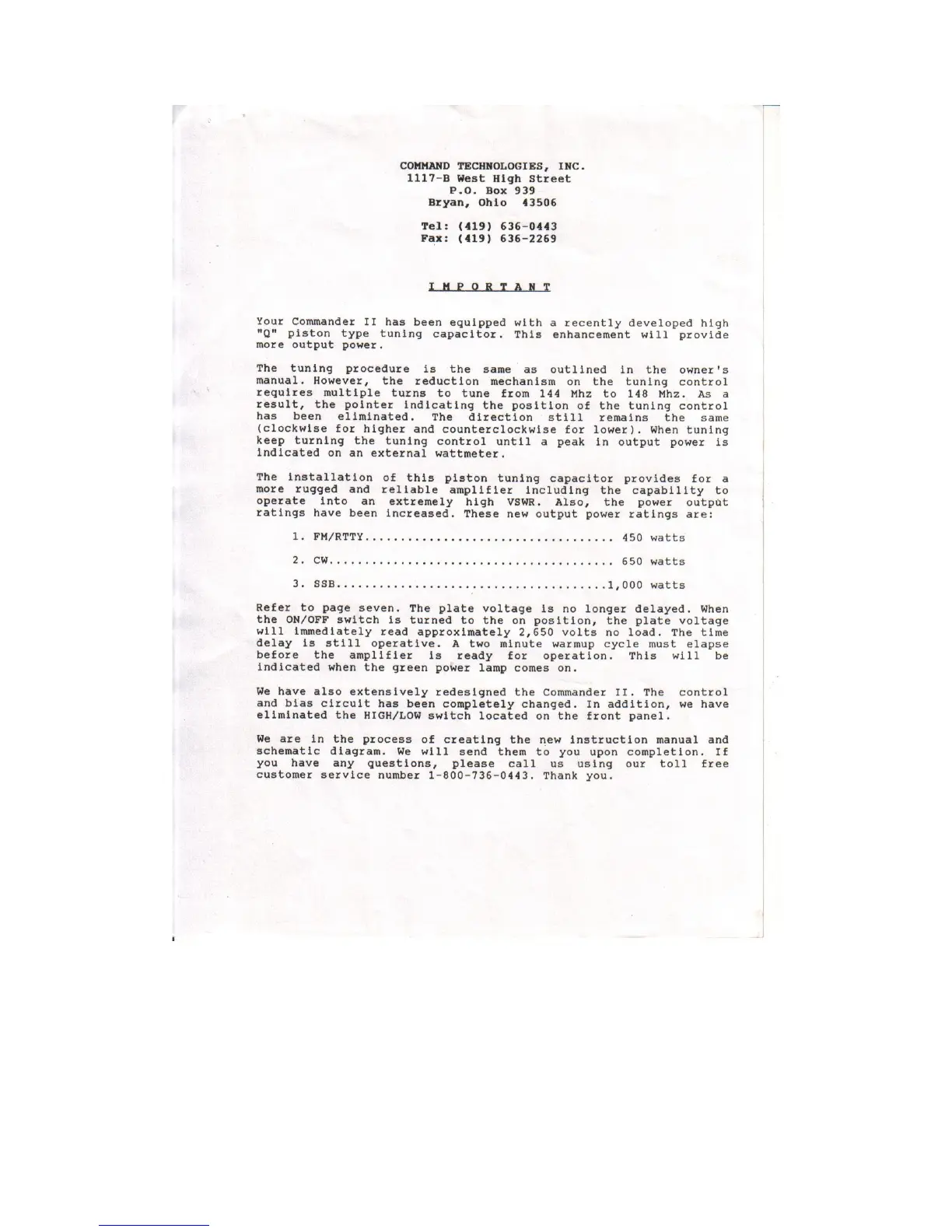 Command Technologies Commander II VHF - Commander II Important Updates; Tuning Capacitor Enhancements; Updated Power Output Ratings; Circuit Design Changes