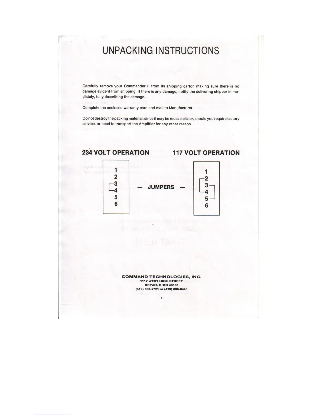 Command Technologies Commander II VHF - Unpacking and Voltage Setup; Unpacking Instructions; Voltage Configuration Jumpers