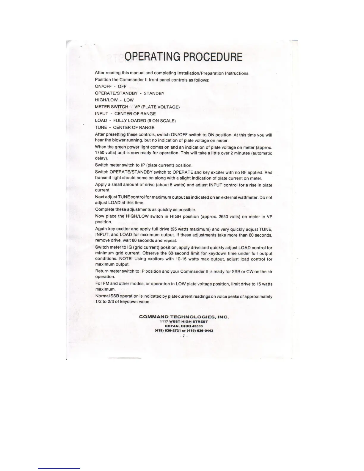 Command Technologies Commander II VHF - Commander II Operating Procedures; Pre-Operation Control Setup; Power-On and System Warm-up; Tuning and Output Adjustment