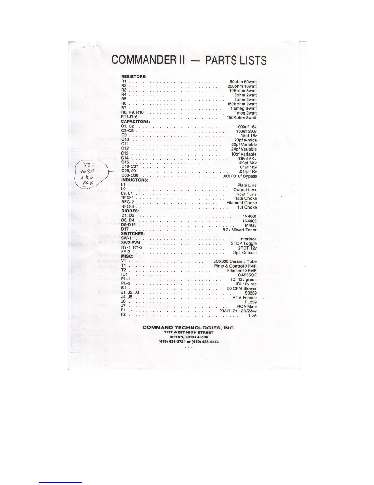 Command Technologies Commander II VHF - Commander II Parts List; Resistors and Capacitors List; Diodes, Switches, and Inductors; Miscellaneous Components