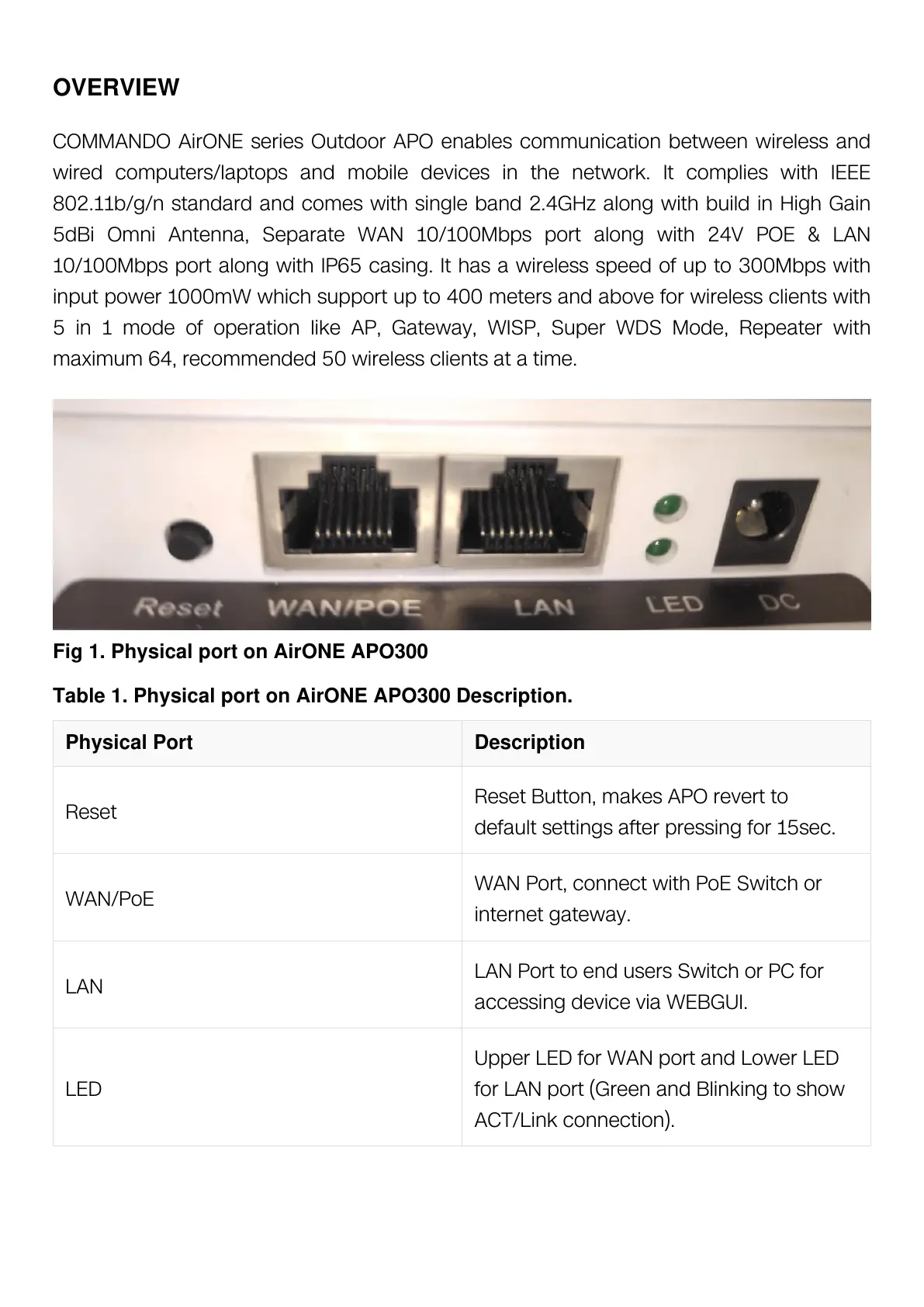 Table 1. Physical port on AirONE APO300 Description.