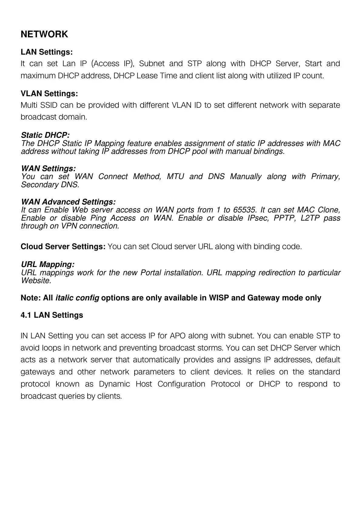 Note: All italic config options are only available in WISP and Gateway mode only