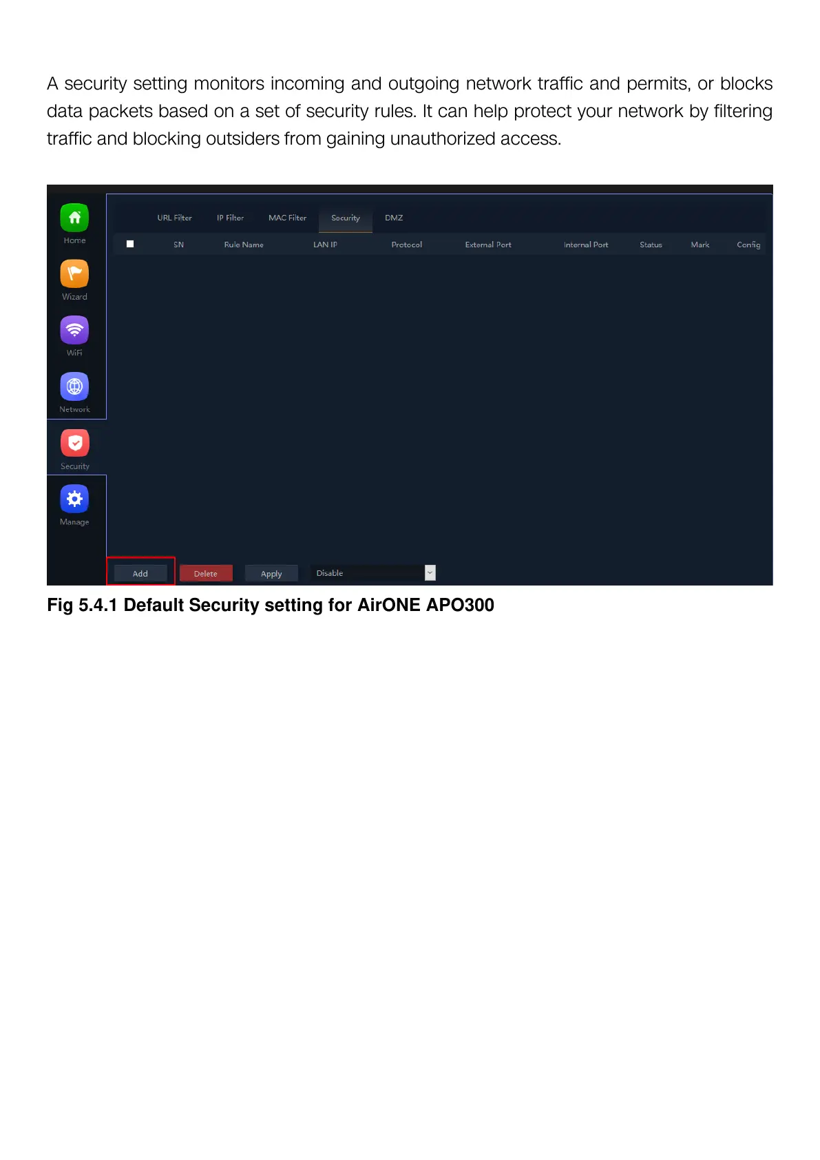 Fig 5.4.1 Default Security setting for AirONE APO300
