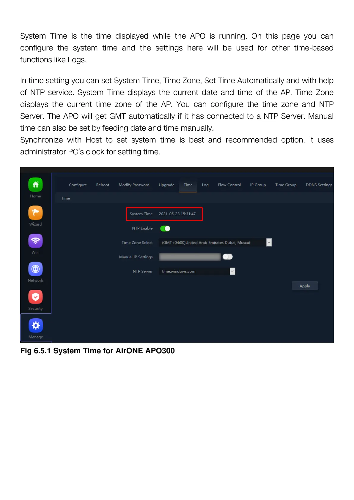 of NTP service. System Time displays the current date and time of the AP. Time Zone