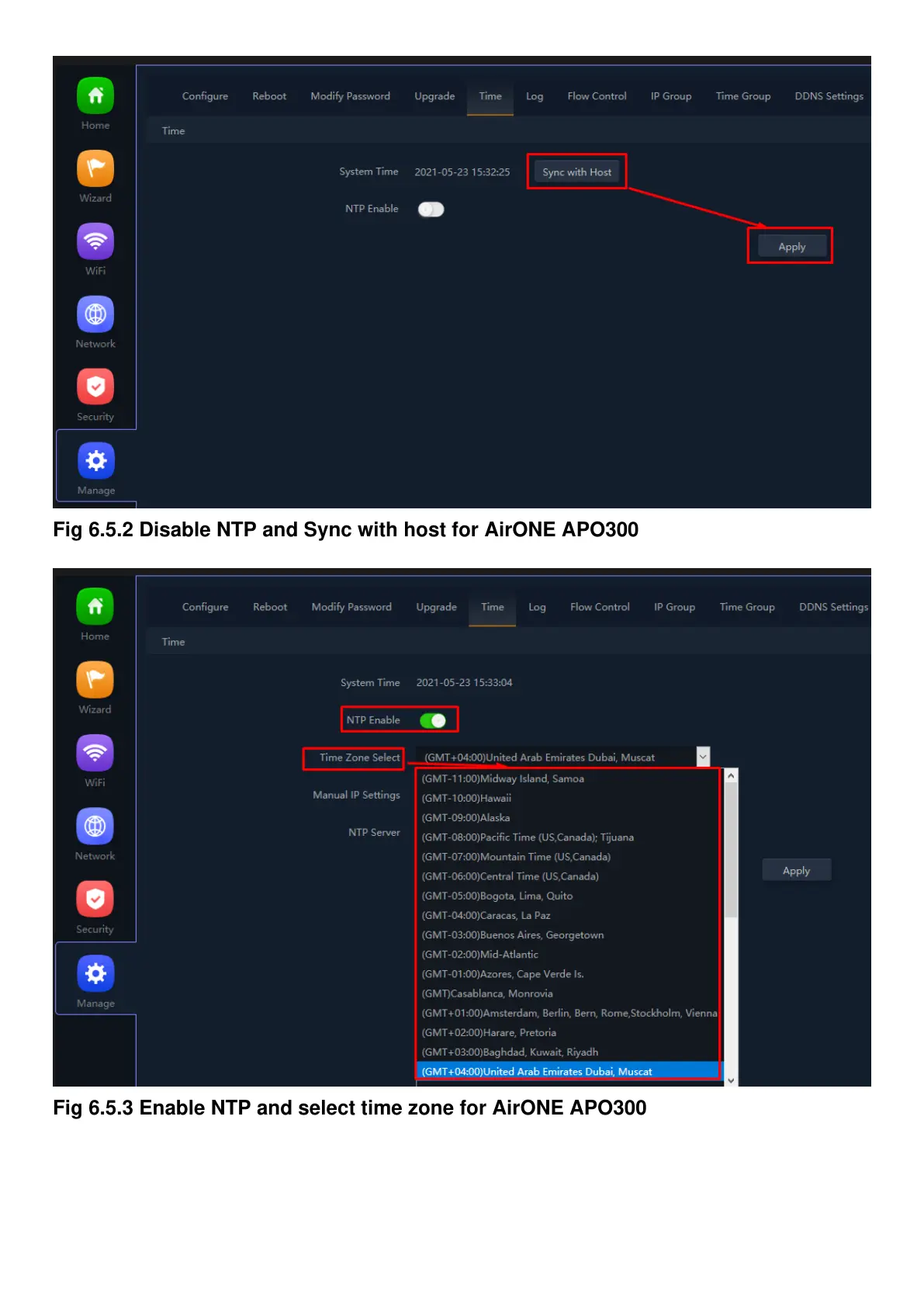 Fig 6.5.3 Enable NTP and select time zone for AirONE APO300