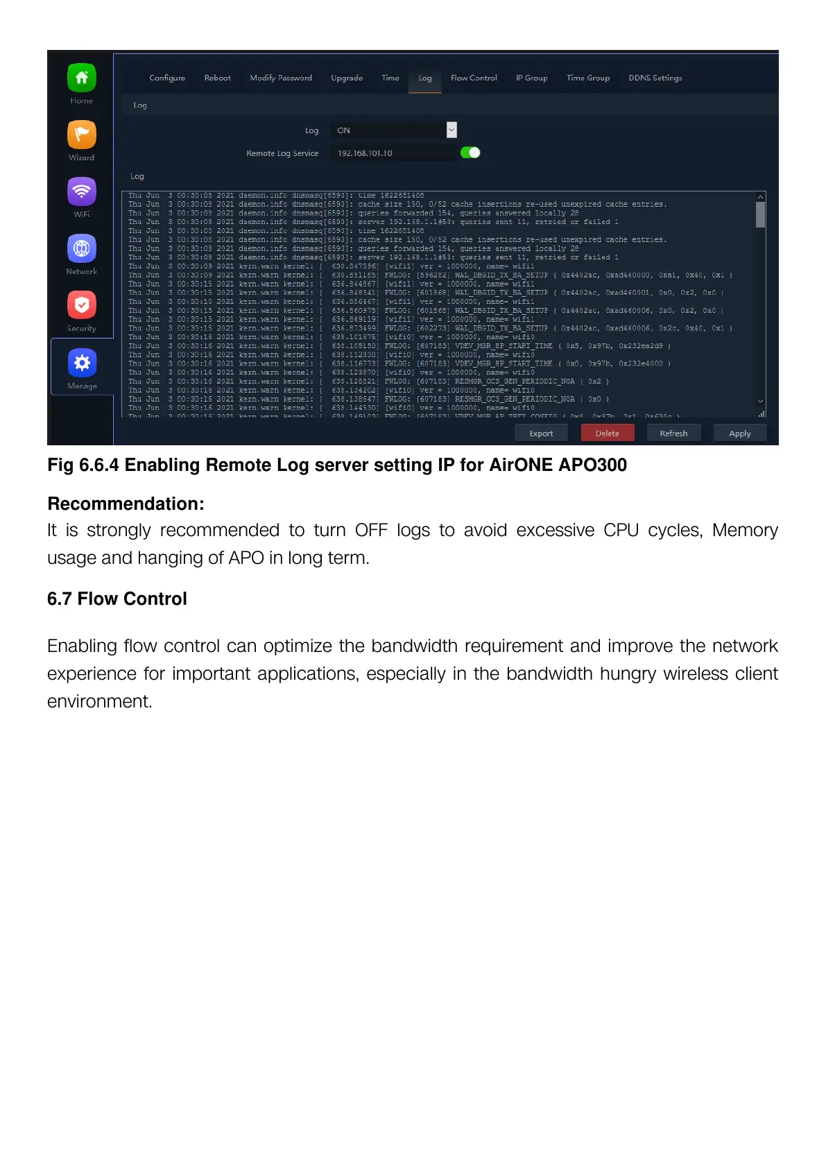 Fig 6.6.4 Enabling Remote Log server setting IP for AirONE APO300