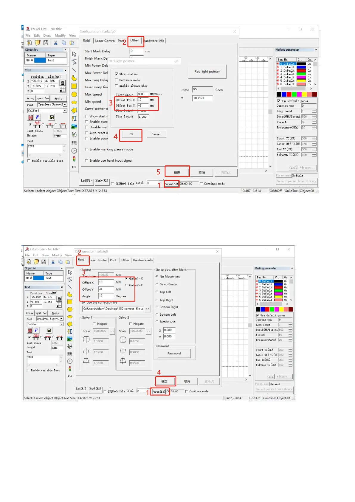 *Click “Parameter (F3)", select "Field". Input numbers in “Offset X", "Offset Y" or “Angle “according to the actual deviation