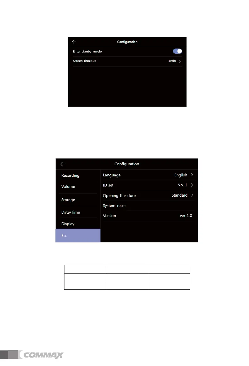 - Screen timeout: To set amount of time for stand-by mode. (Select among 1/2/3 minutes)