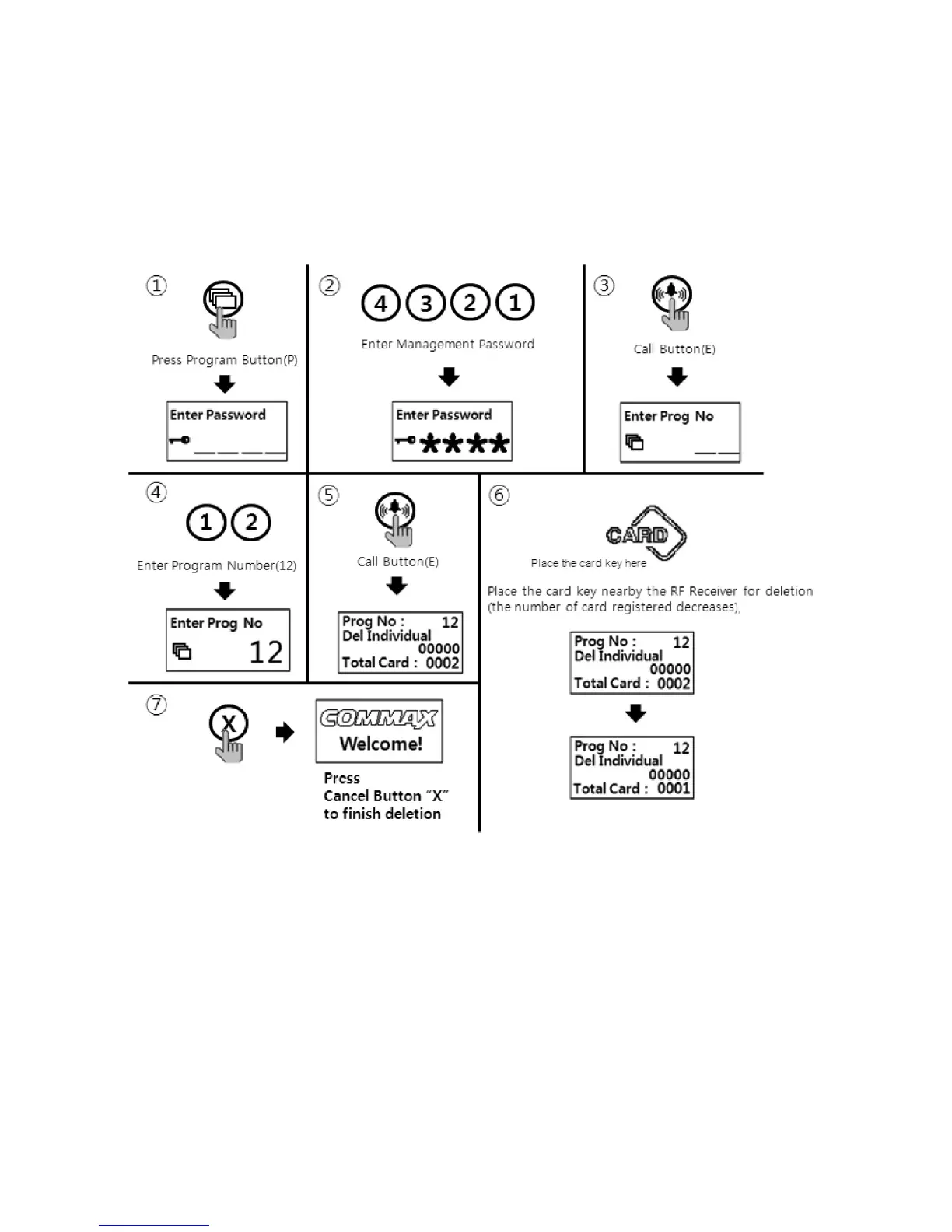 P- Management Password - E - 12 - E - Delete cards - X(Cancel)