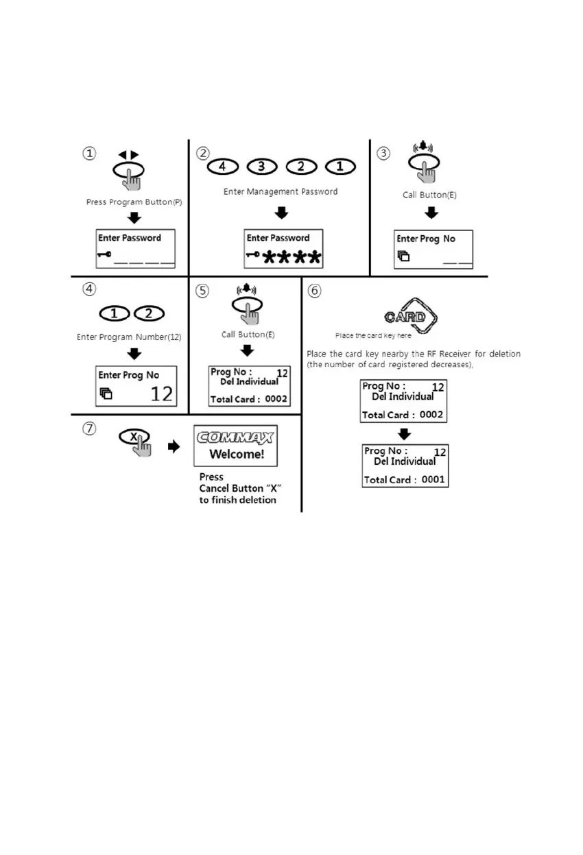 • P - Management Password - E - 12 - E - Delete cards - X(Cancel)