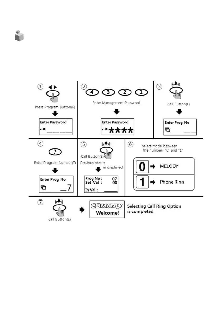 • P - Management password - E - 7 - E - 1 - E : Bell(Ringer sound)