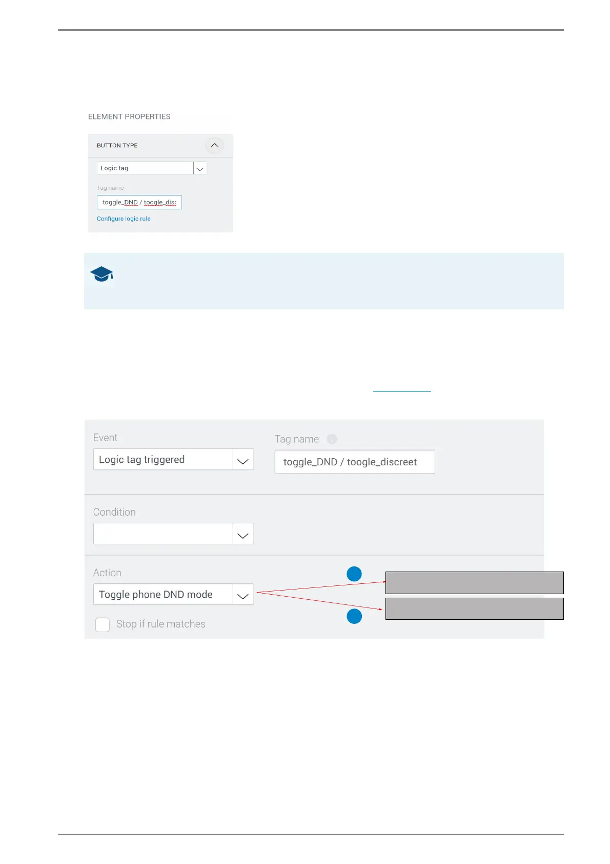 This logic rule toggles the DND mode when the logic tag 1 “toggle_DND” or 2 “toggle_privacy” is