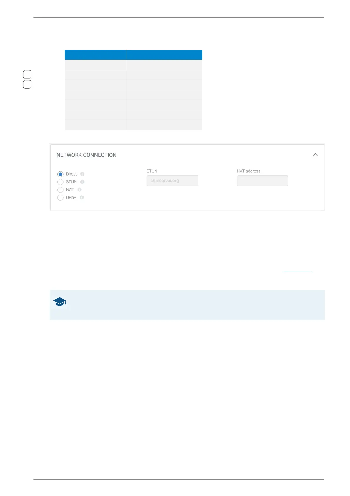 Direct: No firewall is active. The fields STUN and NAT address will be disabled.