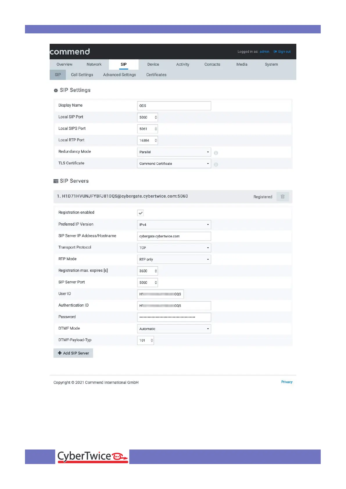 Configure the Commend SIP Intercom Terminal for the CyberGate serviceCyberTwice