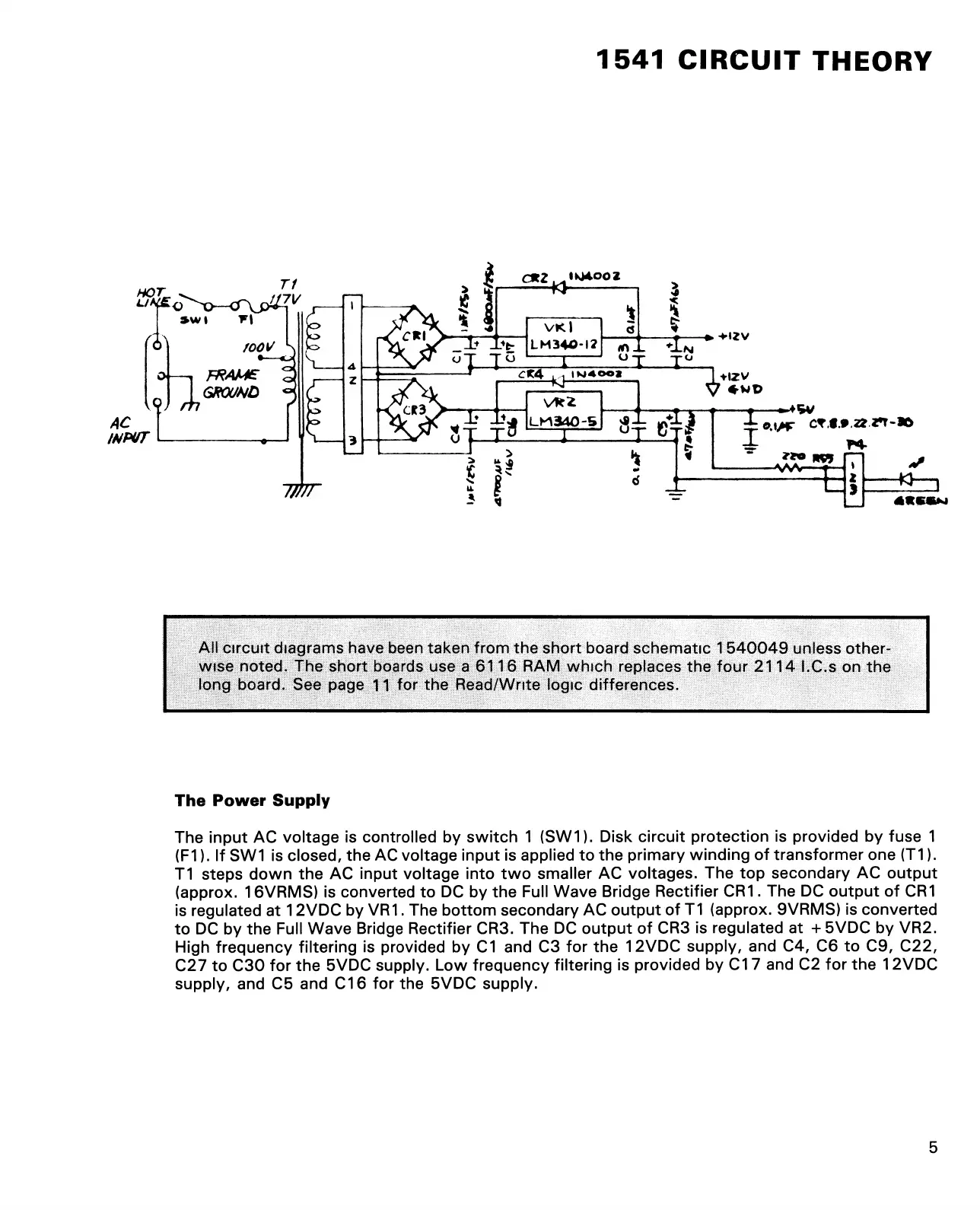 to DC by the Full Wave Bridge Rectifier CR3. The DC output of CR3 is regulated at + 5VDC by VR2.