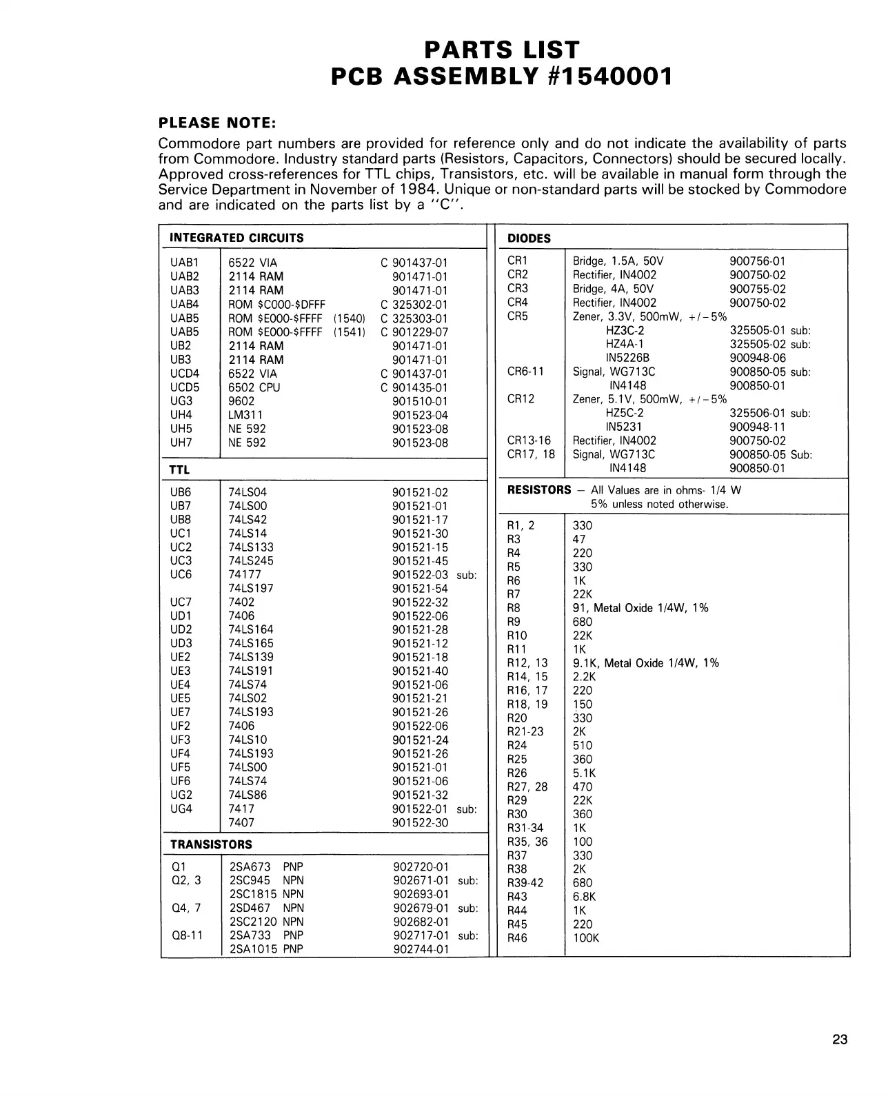 Service Department in November of 1984. Unique or non-standard parts will be stocked by Commodore