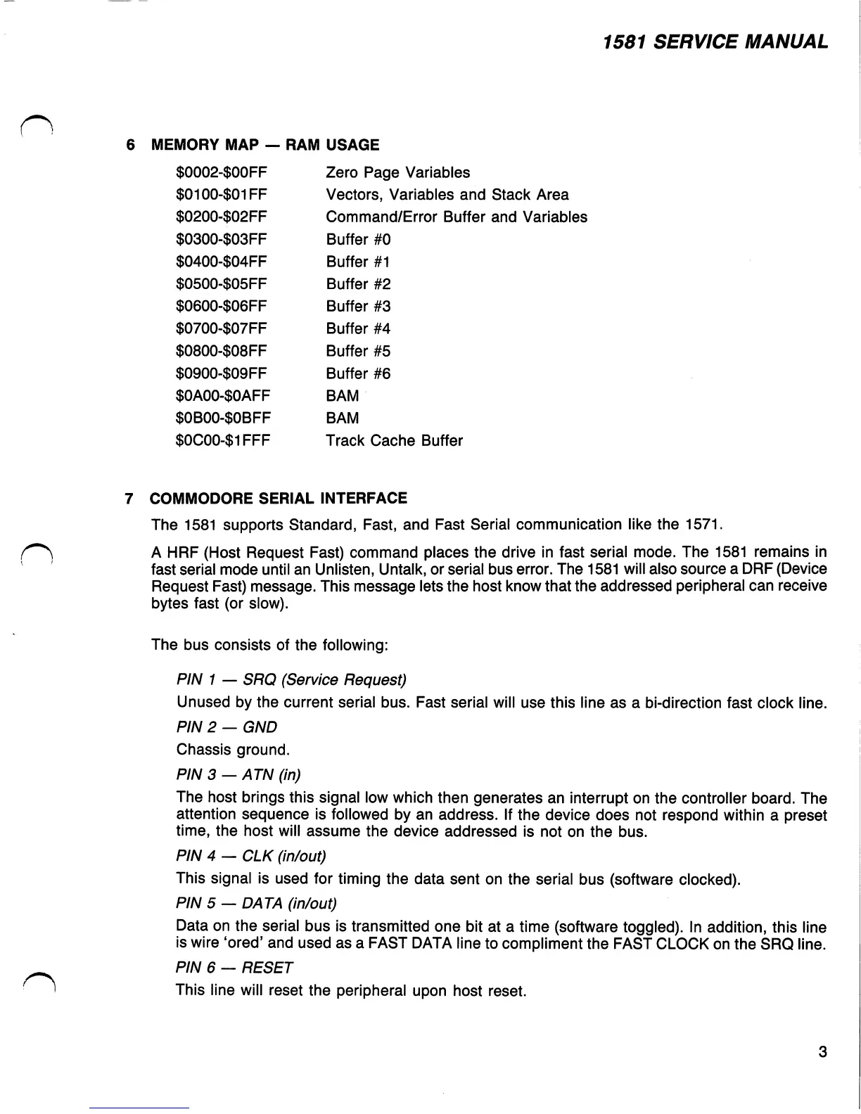 Commodore Computers 1581 - RAM Usage Map; Serial Interface Communication
