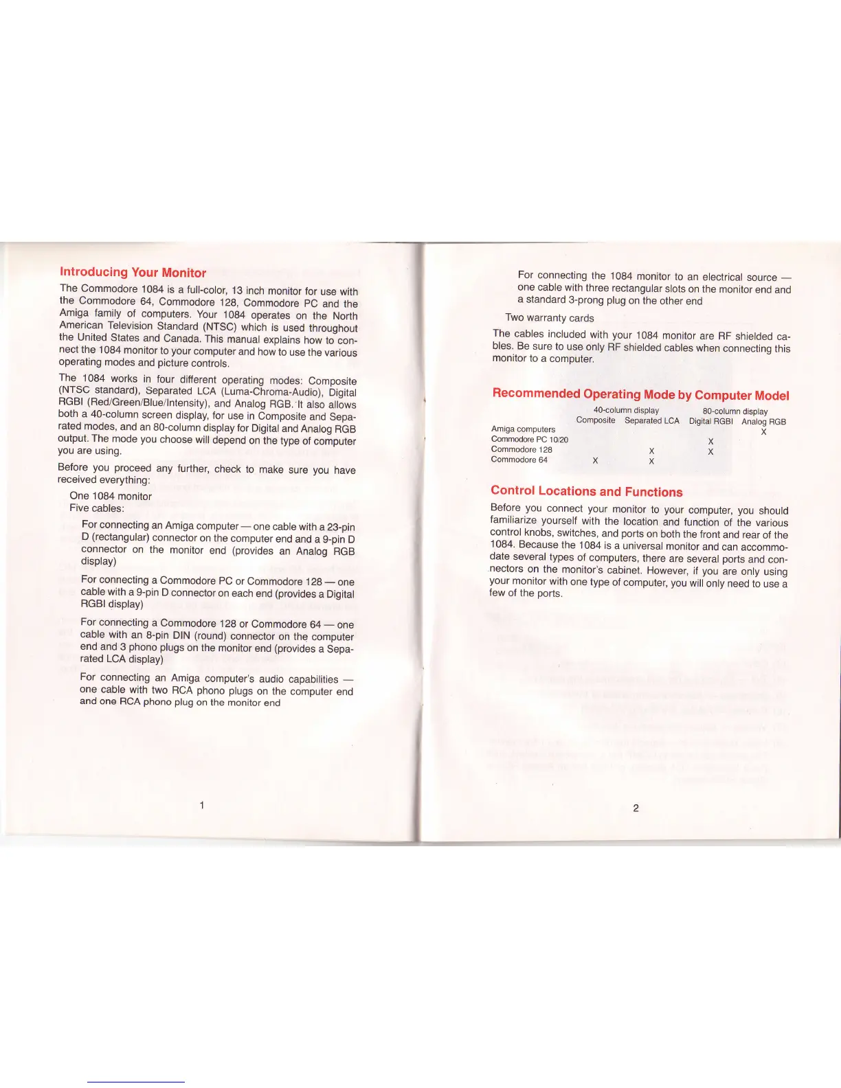 Commodore 1084 - Introduction and Monitor Overview; Introducing Your Monitor; Recommended Operating Mode by Computer Model; Control Locations and Functions