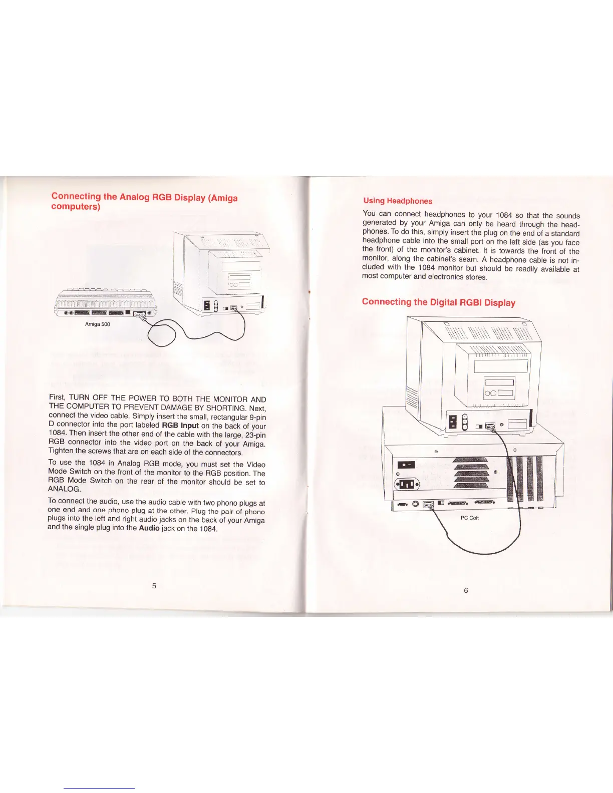 Commodore 1084 - Connecting the Commodore 1084 Monitor; Connecting the Analog RGB Display (Amiga); Using Headphones; Connecting the Digital RGBI Display