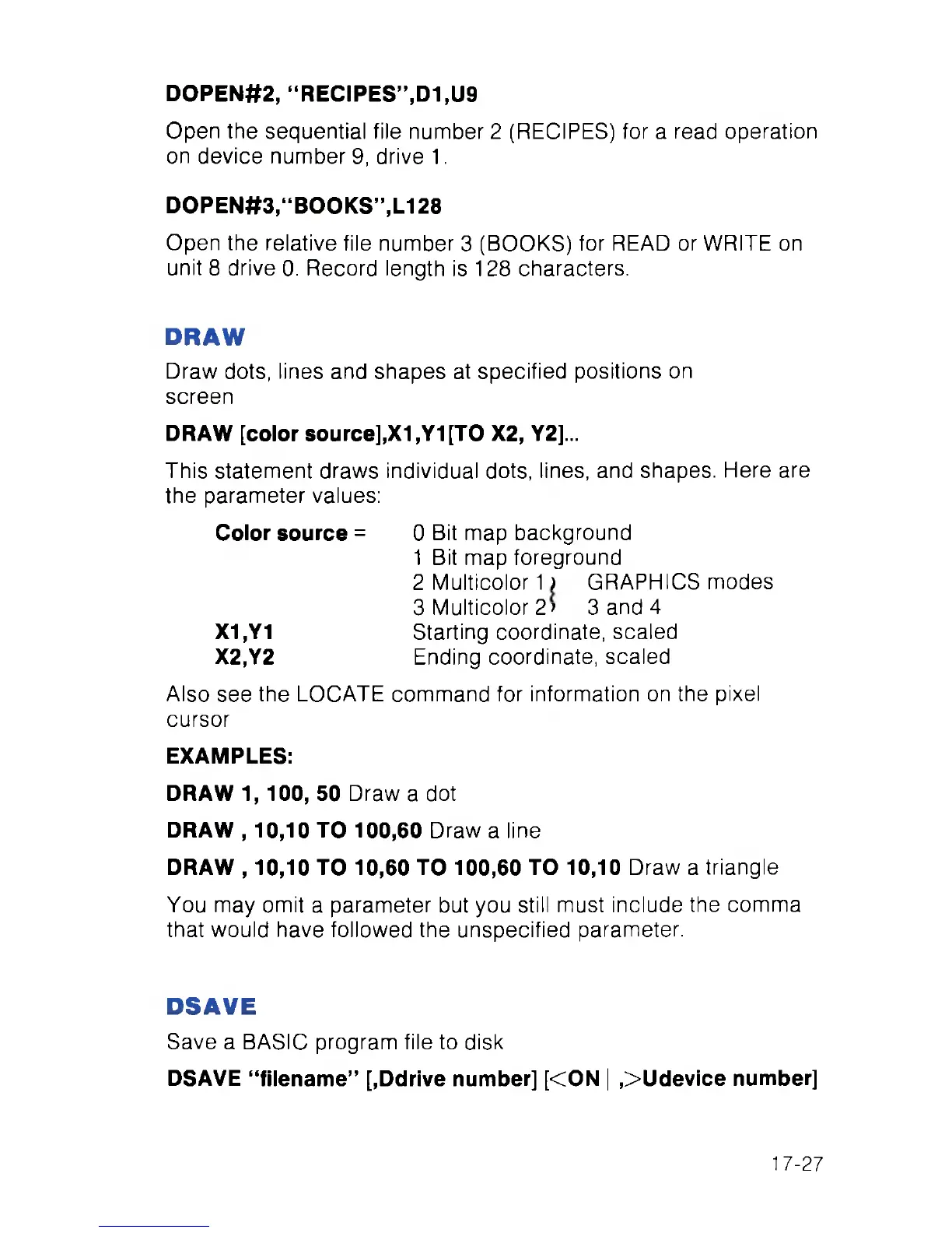DRAW [color source],X1,Y1[TO X2, Y2]...