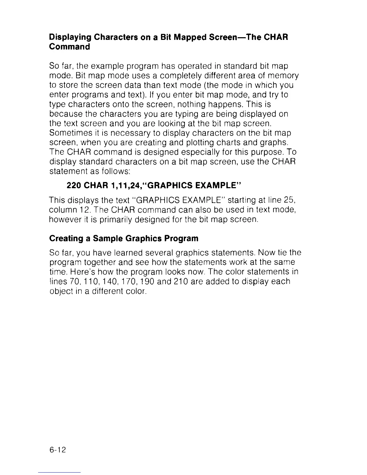 220 CHAR 1,11,24,“GRAPHICS EXAMPLE”