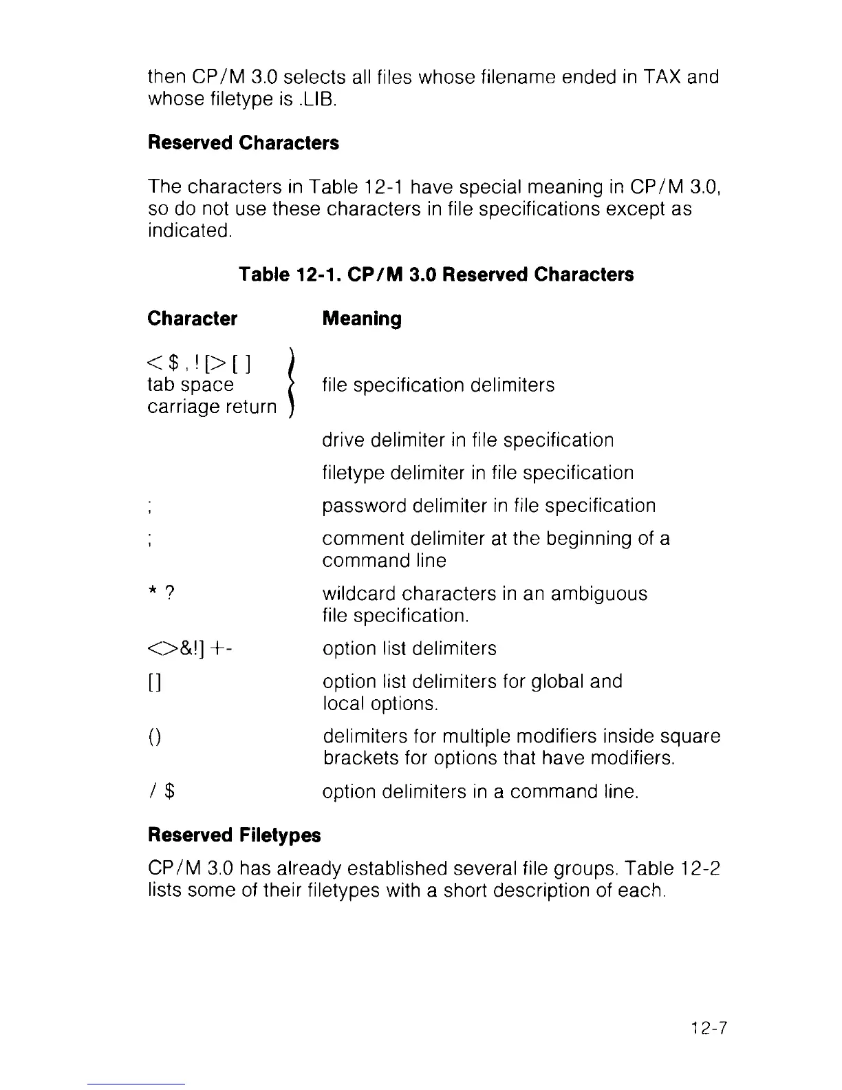 Table 12-1. CP/M 3.0 Reserved Characters