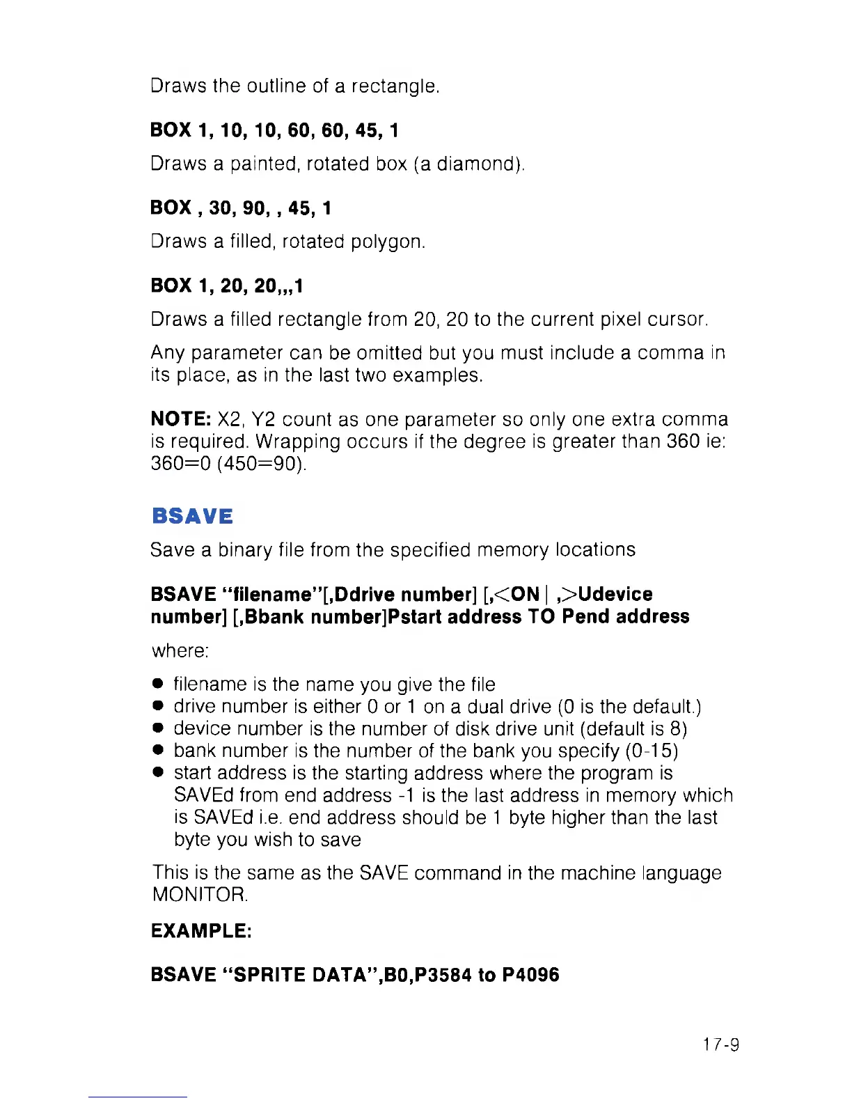 BSAVE “filename”[,Ddrive number] [,<ON | ,>Udevice
