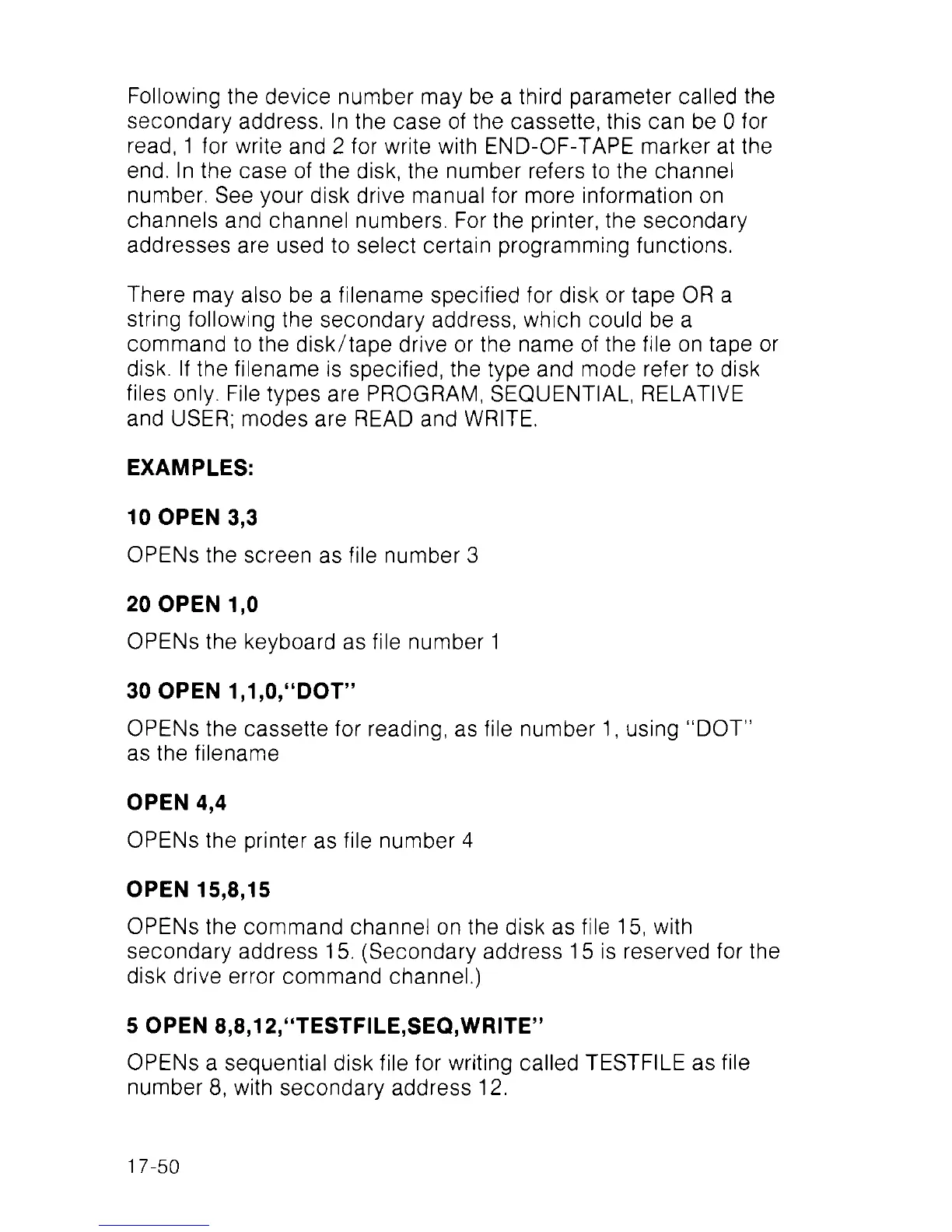 5 OPEN 8,8,12,“TESTFILE.SEQ,WRITE”