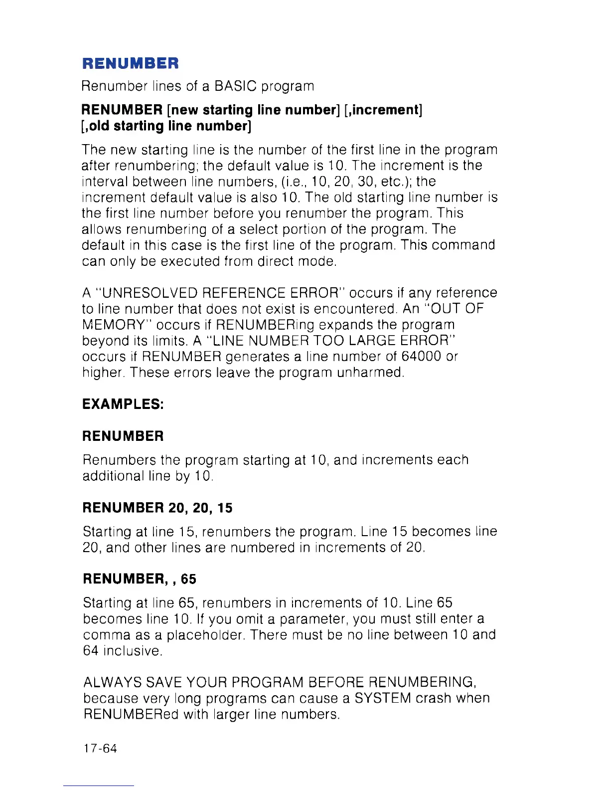 ALWAYS SAVE YOUR PROGRAM BEFORE RENUMBERING,