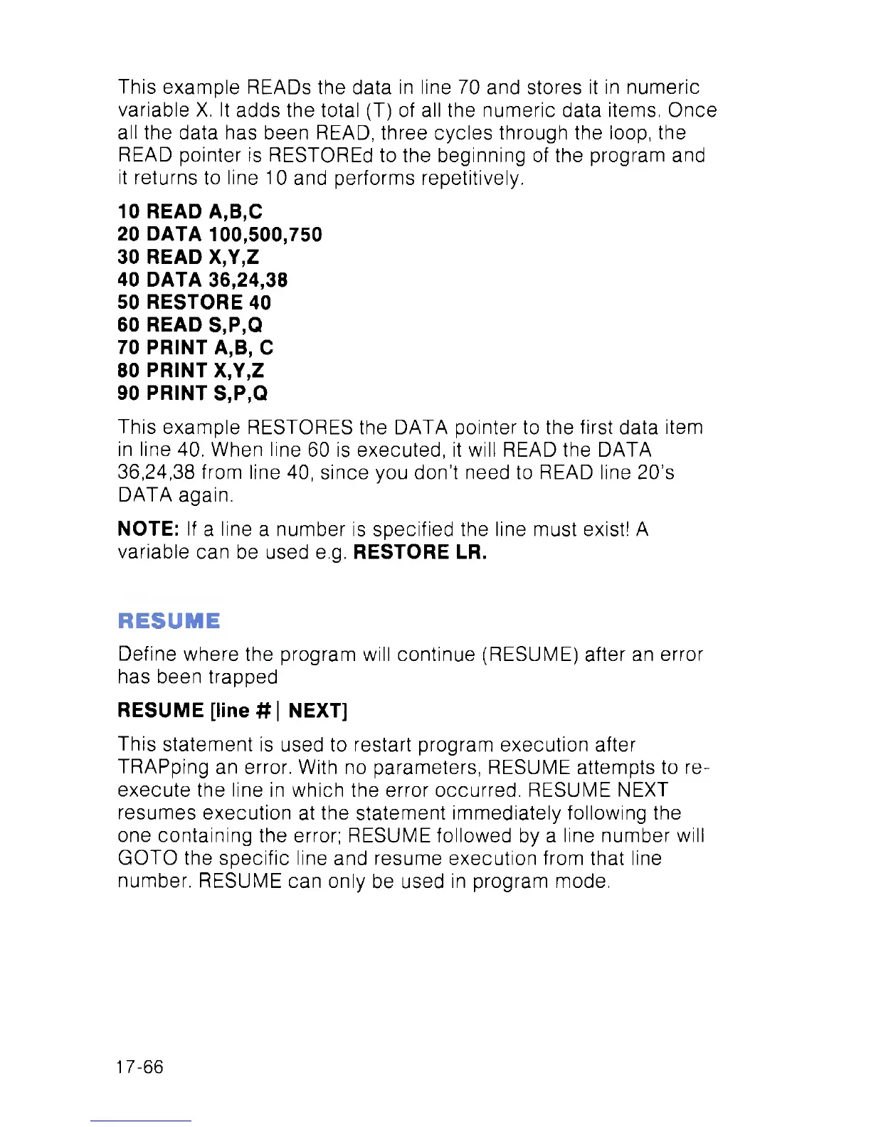 one containing the error; RESUME followed by a line number will