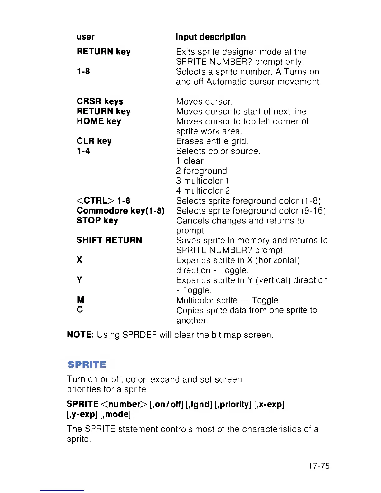 NOTE: Using SPRDEF will clear the bit map screen.