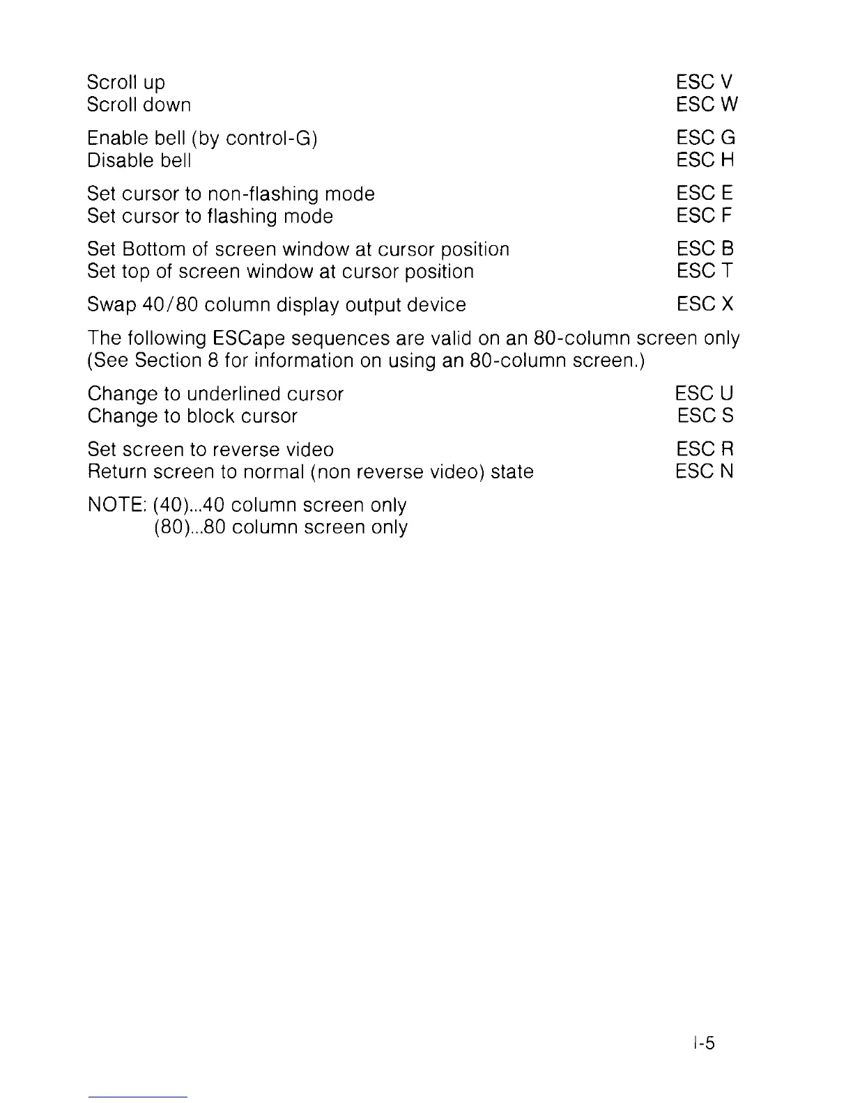 The following ESCape sequences are valid on an 80-column screen only