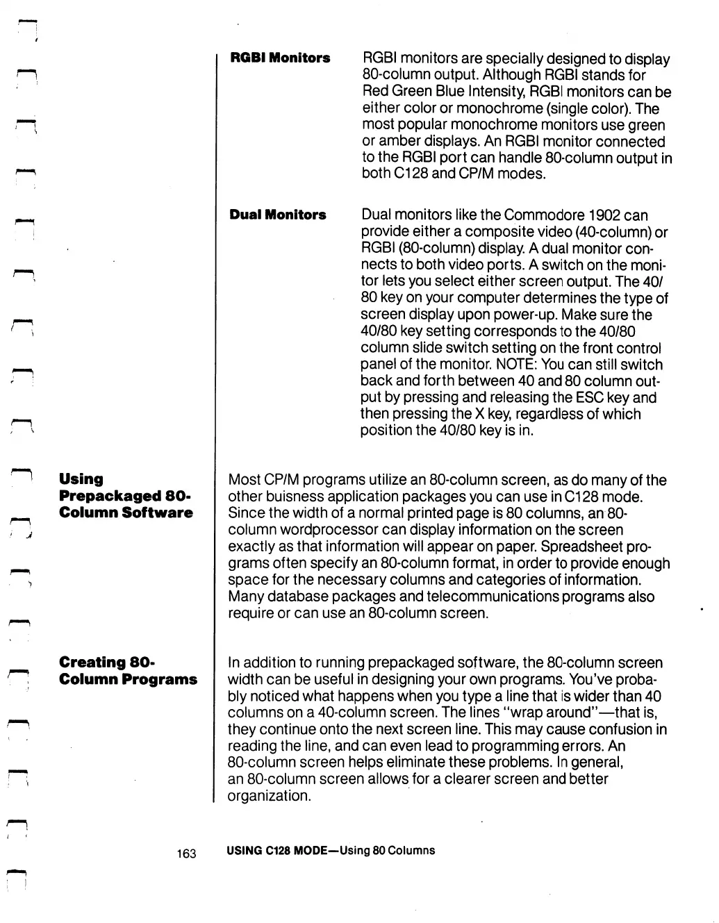 Commodore 128D - RGBI Monitors; Dual Monitors; Creating 80-Column Programs; Using Prepackaged 80-Column Software