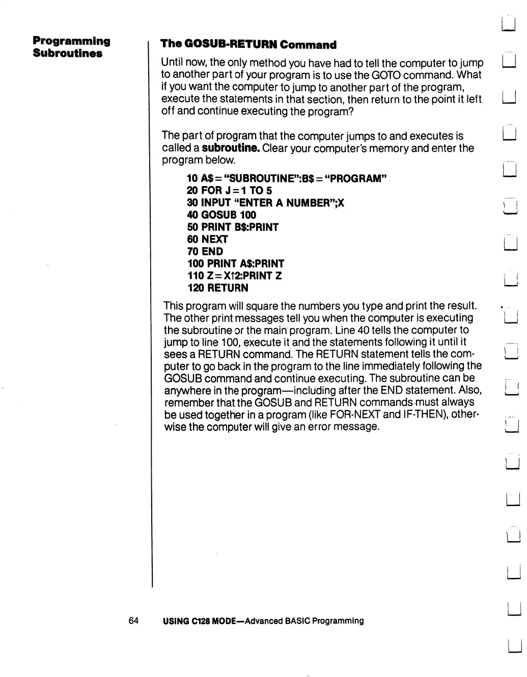 Commodore 128D - Programming Subroutines; The GOSUB-RETURN Command