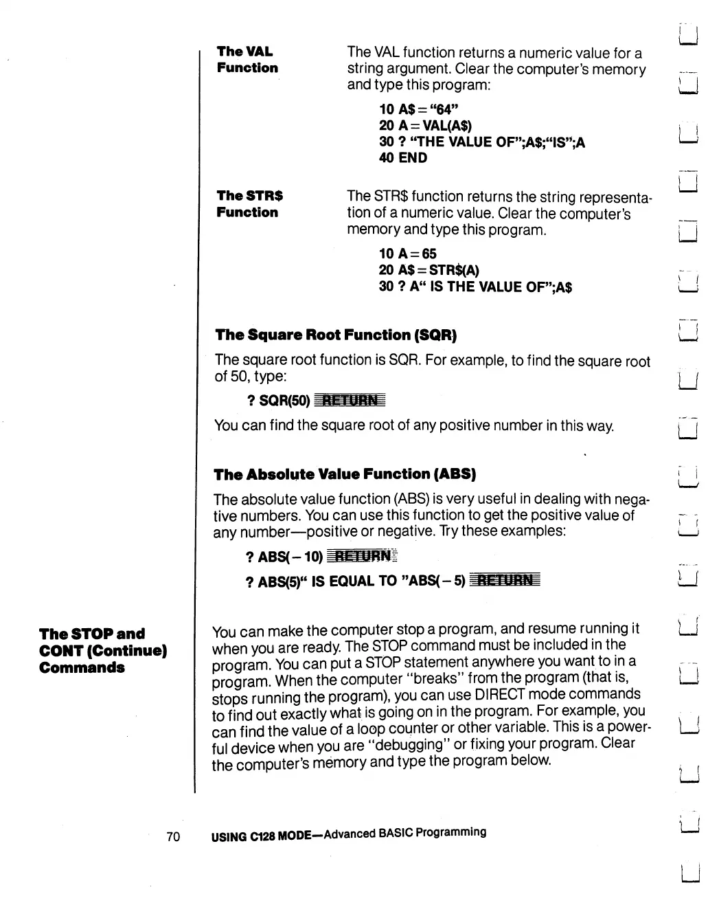 Commodore 128D - The VAL Function; The STR$ Function; The Square Root Function (SQR); The Absolute Value Function (ABS)